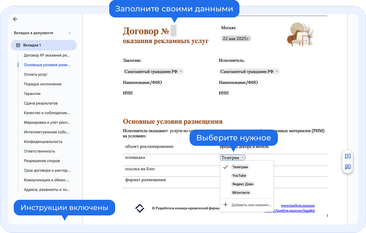 Это не шаблоны из интернета, это документы, с которыми мы работали сами и защищали интересы наших доверителей: их подписывали бренды, фабрики, подрядчики, ритейлеры и блогеры.